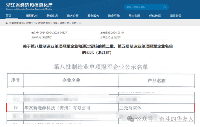 近日,華友新能源科技(衢州)有限公司(以下簡稱“華友新能源衢州”)成功入選——第八批制造業單項冠軍企業名單,展現出了公司在新能源鋰電材料領域卓越的技術創新能力和市場領導力。