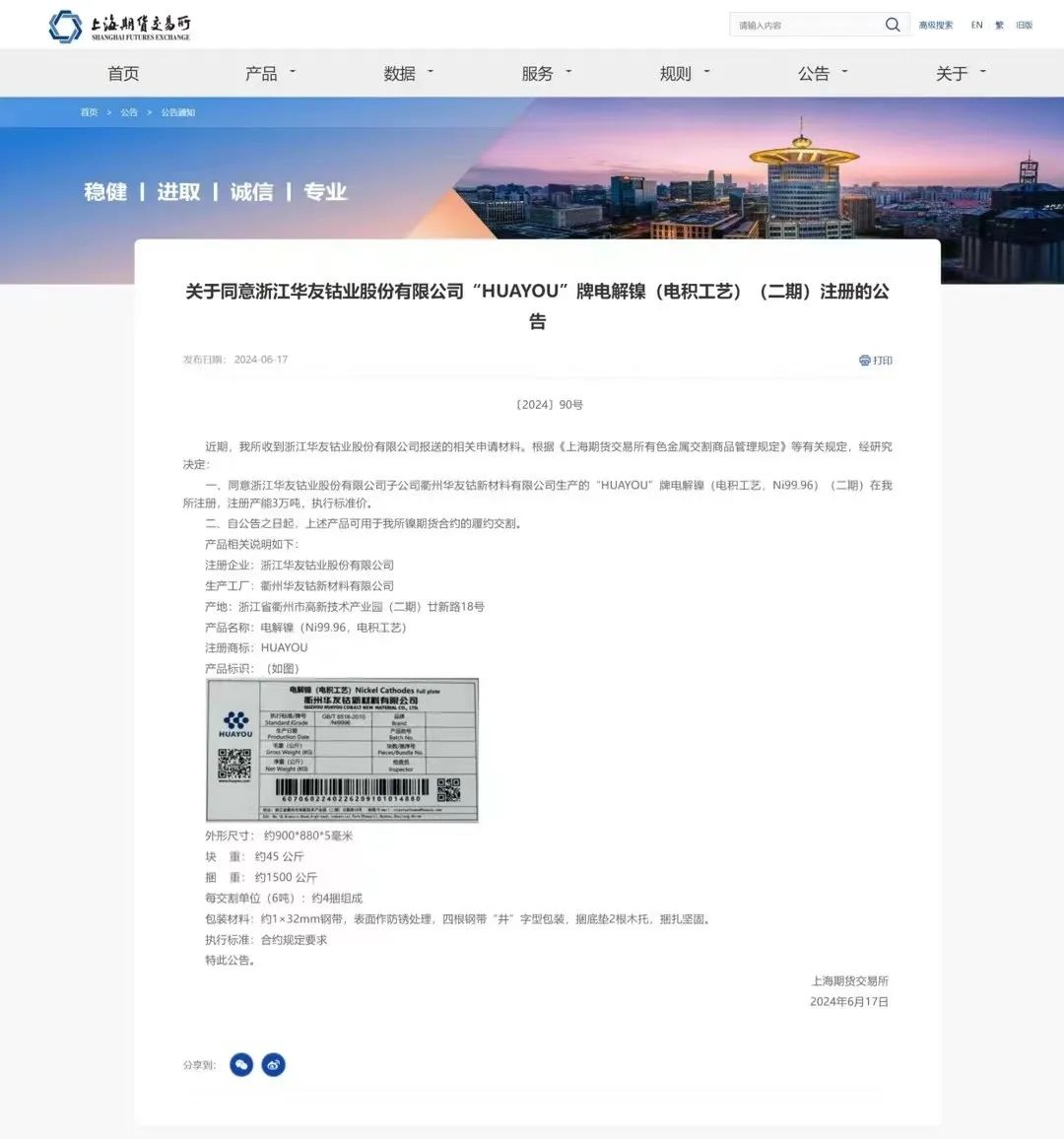 “HUAYOU”牌電解鎳(二期)自2024年1月份起,公司與上海期貨交易所積極溝通,經過嚴格的實地考察和抽樣檢驗,最終上海期貨交易所認定華友鈷業生產的“HUAYOU”牌電解鎳(二期)符合交割品牌的各項要求,允許成為交割品牌,自此印有“HUAYOU”標識的電解鎳將再次走進客戶心中。