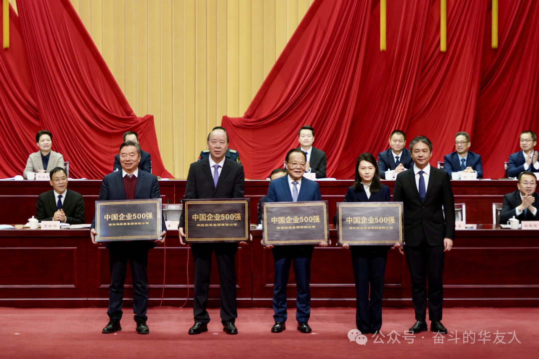 ▲桐鄉市委書記王堅為“中國企業500強”桐鄉上榜企業授牌,華友控股集團副董事長陳曉琳(右二)代表華友鈷業接受表彰。