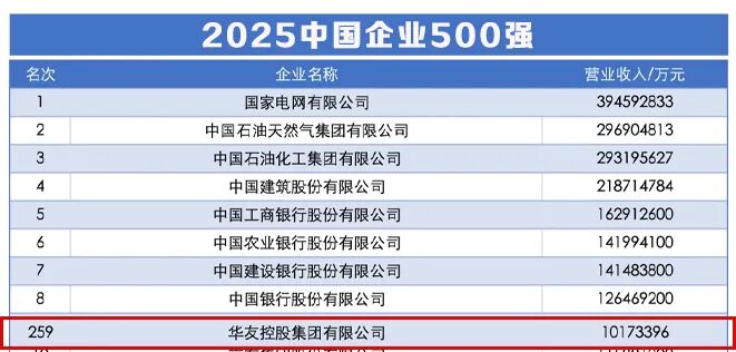 華友控股集團躋身2025中國企業500強,259位!