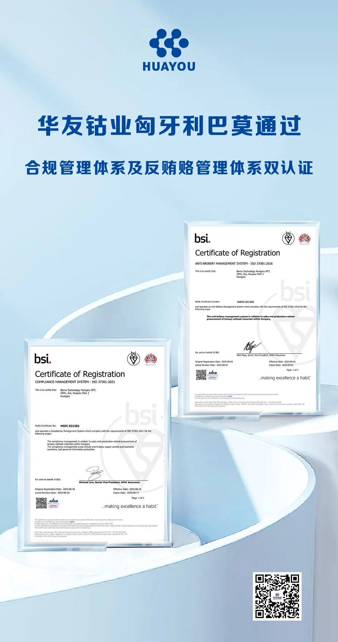 9月15日,華友鈷業(yè)旗下巴莫科技(匈牙利)有限公司(以下簡稱“匈牙利巴莫”)合規(guī)管理體系及反賄賂管理體系認(rèn)證頒證儀式舉行,標(biāo)志著匈牙利巴莫成為匈牙利首家通過ISO 37301合規(guī)管理體系及ISO 37001反賄賂管理體系雙認(rèn)證的中資企業(yè),彰顯了華友在新能源鋰電材料領(lǐng)域的合規(guī)管理領(lǐng)先地位。