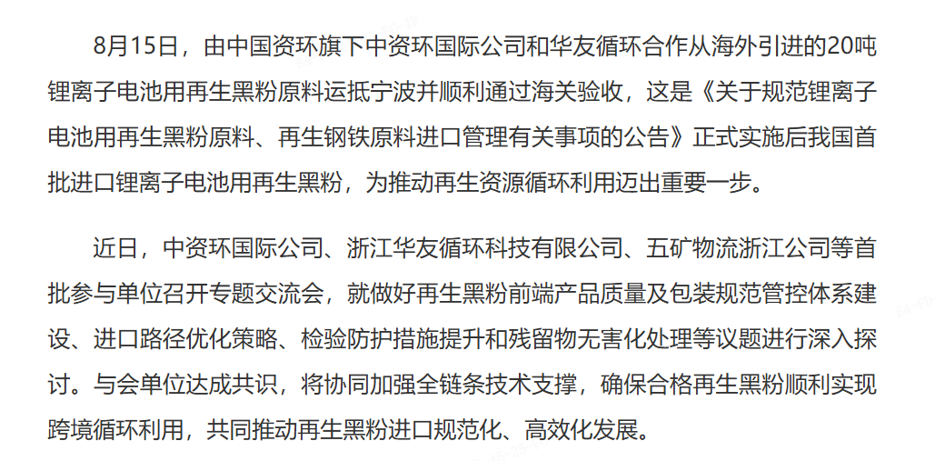 8月15日,由中國資環(huán)旗下中資環(huán)國際公司和華友循環(huán)合作從海外引進(jìn)的20噸鋰離子電池用再生黑粉原料運(yùn)抵寧波并順利通過海關(guān)驗(yàn)收,這是《關(guān)于規(guī)范鋰離子電池用再生黑粉原料、再生鋼鐵原料進(jìn)口管理有關(guān)事項(xiàng)的公告》正式實(shí)施后我國首批進(jìn)口鋰離子電池用再生黑粉,為推動(dòng)再生資源循環(huán)利用邁出重要一步。